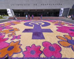 Estudiantes de diversas Prepas UDG participaron en el montaje de un “Tapete efímero” en la explanada del edificio de la Rectoría General de esta Casa de Estudio, mediante el cual buscan visibilizar las luchas en favor de la igualdad de género.